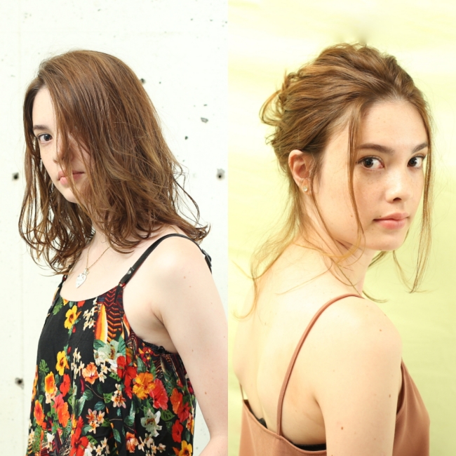 | STYLING | -STYLING1- 顔周りをリバースにコテで巻き全体を一回転半でランダムに細かく巻きます。ハーフウェットの質感をだし抜け感をよりだします。 |
